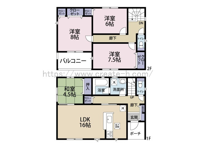 | 間取詳細 | (1階)LDK16、(1階)和4.5、(2階)洋8、(2階)洋7.5、(2階)洋6 | ||