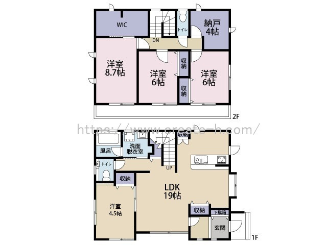 | 間取詳細 | (1階)LDK19、(1階)洋4.5、(2階)洋8.7、(2階)洋6、(2階)洋6、(2階)納戸4 | ||